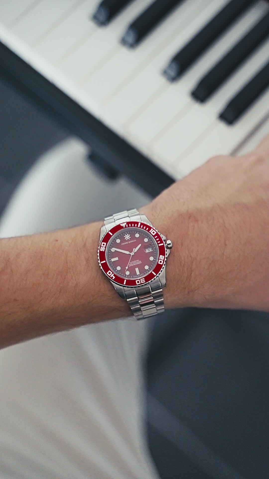 Die Pierre Moreau® Lémaris Monochrome in Rot ist Ausdruck von Selbstbewusstsein und Charakter. Lünette und Zifferblatt erscheinen im gleichen, intensiven Rotton und verleihen der Uhr einen dynamischen, kraftvollen Auftritt. Gefertigt aus 316L-Edelstahl mit einem Gehäusedurchmesser von 41 mm und flacher Silhouette (10,1 mm Höhe), überzeugt sie durch Komfort und Präsenz. Das Schweizer Ronda 515 Quarzwerk mit EOL-Funktion sorgt für präzise Zeitmessung. 10 ATM Wasserdichtigkeit und kratzfestes Saphirglas runden die sportlich-elegante Performance ab.